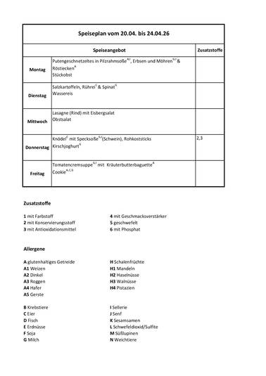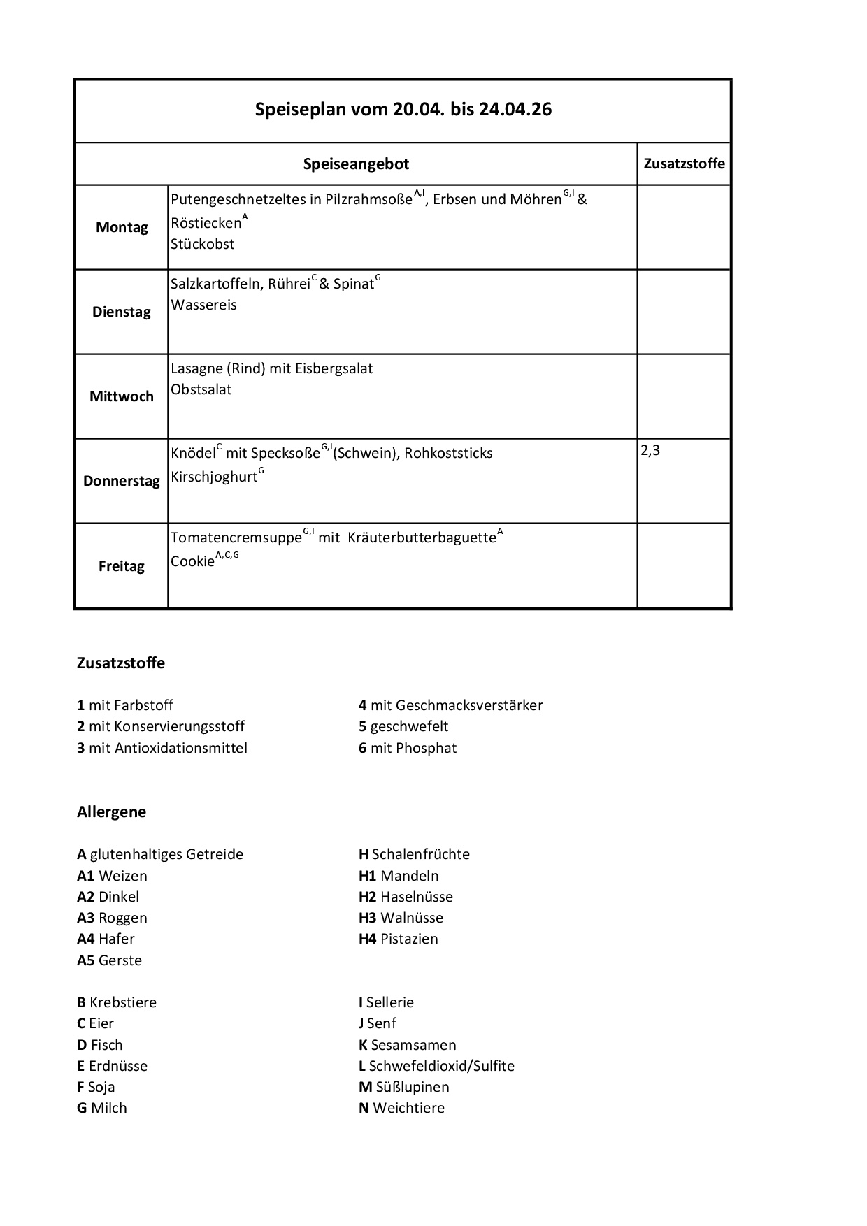 Speiseplan vom 20.04.2026 bis zum 24.04.2026
