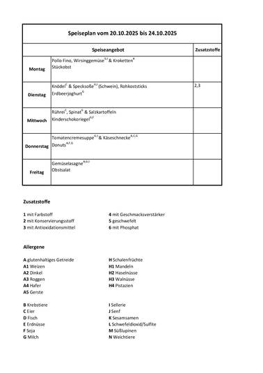 Speiseplan vom 20.10.2025 bis zum 24.10.2025